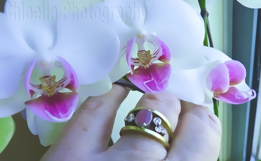 This gorgeous Orchid was given to my MIL by a close friend. They are such beautiful delicate flowers. A pink orchid conveys pure affection, which is very evident these past two weeks in the outpouring of love towards MIL. I couldn’t help but notice the similarity in color to the main stone (my birthstone Garnet) in my wedding ring. I did process this photo a little bit in Lightroom and Photoshop.