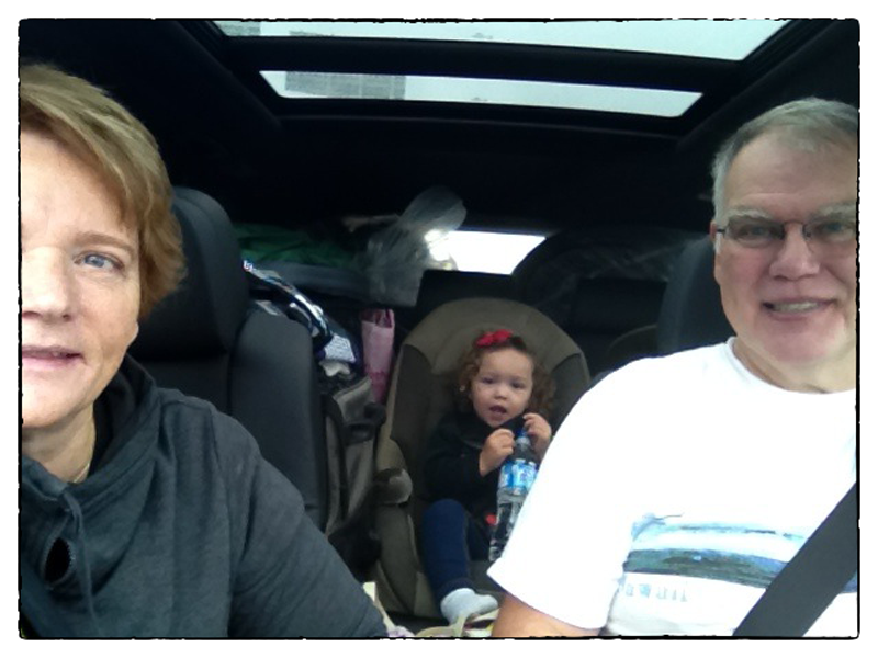 We’re on our first leg of a 4 day road trip to California with the baby. This picture is taken at the Pacific Border Crossing between Surrey, BC and Blaine, WA. We’ve got a six to seven hour drive ahead of us to just south of Portland, OR. Baby Girl is snuggled in and happy. What an awesome little traveler she is too. It took an hour to get through the border, and another 20 minutes to Bellingham where we gassed up. She’d been in the car two hours by then, with no fussing what so ever. I let her out to run around at the Fred Meyer in North Bellingham while hubby gassed up the car. The rest of the trip was uneventful with just a couple of rest stops for food and stretching our legs. I did load up my iPad with a few of her favorite shows, which kept her entertained during part of the trip. For much of the time she either slept, or chatted with us or herself, and sang songs . . . one of the most fun drives south I’ve had in a long time. We’ll be two days at my son’s south of Portland before we head out again.