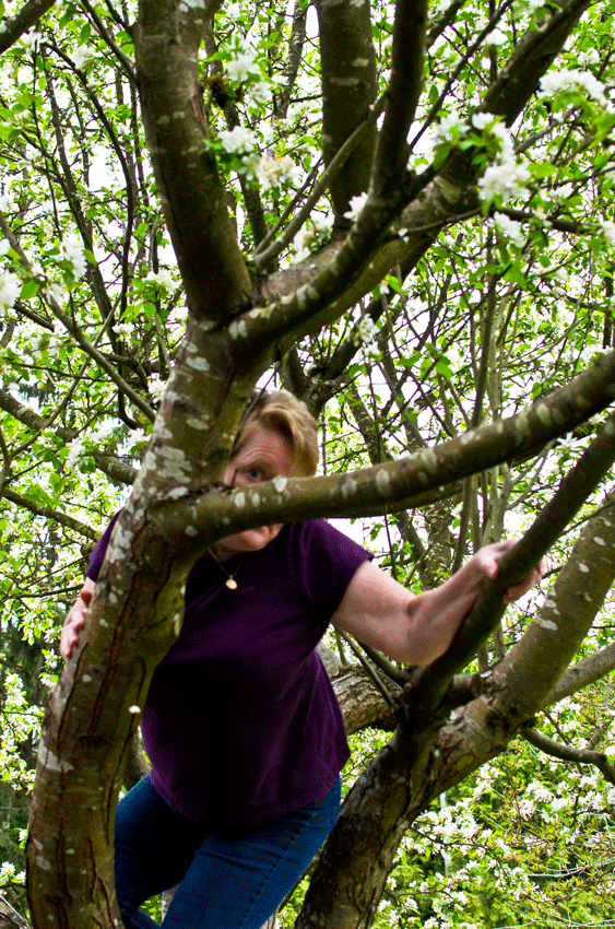I’m so lucky to live where I live. I have two acres surrounded by forest and parkland, with a creek running along one side. We live in suburbia, but I feel like I’m living in the wilderness at times. This is the time of year that I relish the beauty around me as the earth erupts from Winters sleep in all her beauty and splendor. Last year I captured a great shot of my Granddaughter up in the Crab Apple tree, so this year I though maybe I could do the same shot for my 365 Self Portrait. Well . . . I’m not a Spring Chicken anymore .. . but I gave it a good college try! Oh to be young again!