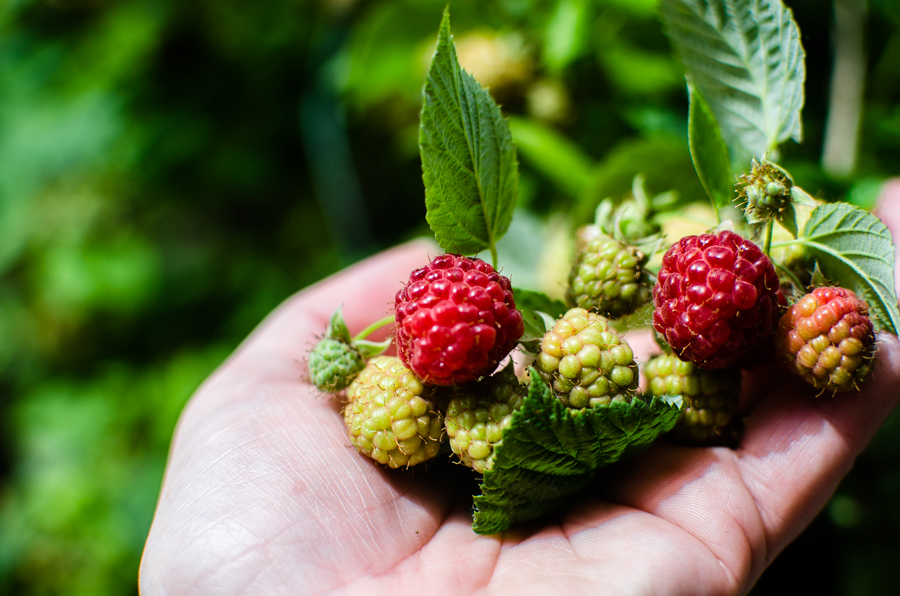 So yesterday I posted a picture of the gorgeous and yummy Salmon Berries that are ripening in the park out back. This morning I decided to check on my raspberry patch – 50 feet of canes that we’ve planted and nurtured of the last few years. It’s been so wet, and not much sun lately so I wasn’t expecting to see anything red. Tons and tons of green berries that are going to provide us with a freezer full of fruit here soon . . . so to my surprise I discovered these two beautiful read delectable’s. They didn’t last long though as my 4yr old Great Nephew happened along and then they were gone! I’m looking forward to the bounty soon enough . . .