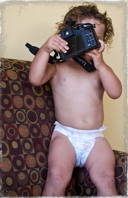 My Granddaughter see’s both her mother & myself with a camera . . . taking pics of her! I was working on my laptop, processing pics from the day when I looked over to see this vision . . . she had her Mommie’s camera with the strap around her neck, trying to take a picture of me! She kept saying “I see you!”