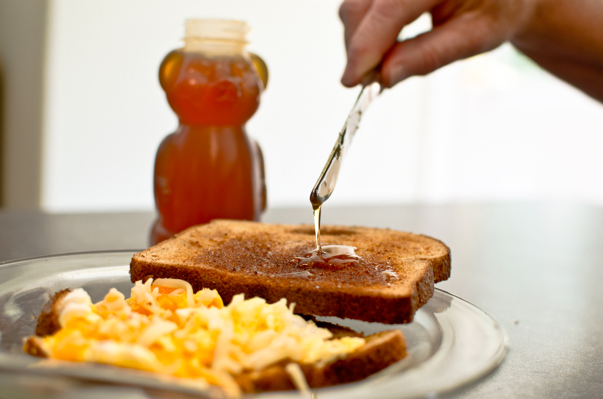 Today’s shot is Honey Bear’s first breakfast in Canada. Poached eggs and toast with honey. Very yummy honey! Not sure exactly what type of honey it is . . . but it’s very light and flavorful!